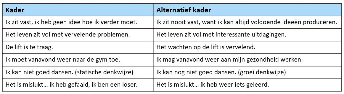 Twee bekende kaders zijn bijvoorbeeld het optimistische kader en het pessimistische kader. Optimisten hebben de neiging het glas als halfvol te zien en pessimisten hebben de neiging het glas als halfleeg te zien. Dezelfde realiteit, verschillende manieren om ernaar te kijken. Enkele voorbeelden van kaders en mogelijke alternatieven: